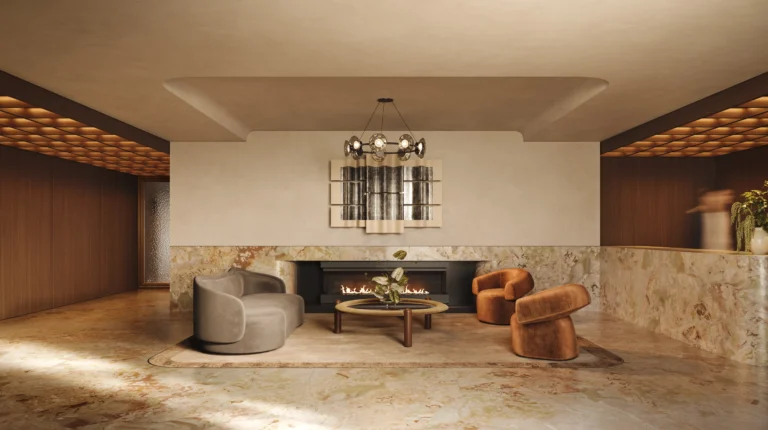 A new gym and wellness space is envisioned as a refined retreat for residents, where movement and mindfulness meet in a serene, light filled setting. Soft textures, natural materials, and a calming palette create an atmosphere of quiet sophistication and ease. Designed to feel private and restorative, it offers an elevated environment that supports both energy and stillness.