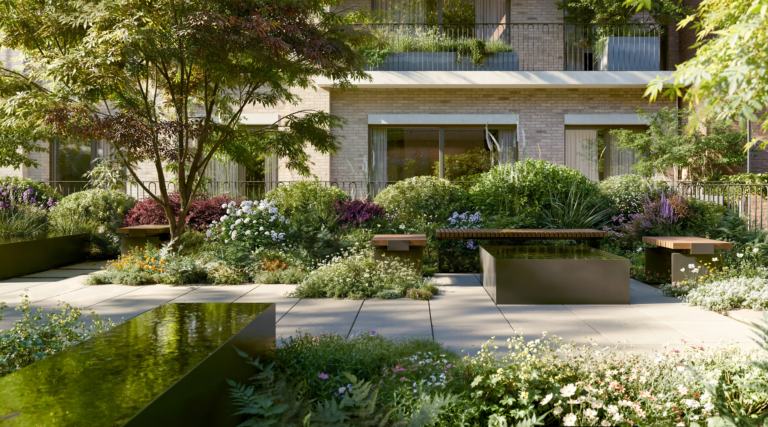 A sculptural, heavy bronze door opens through to the ground floor lounge, a stimulating interplay of traditional materials and modern forms, beautiful furniture and atmospheric lighting. Wide, welcoming and built around a sculptural marble fireplace, this is a refined take on a traditional reception, with a discrete concierge service on call at all times. Further exploration reveals more carefully considered, inspiring detail: a generous use of space and light; luxurious material throughout, from timberwall and ceiling panelling to vein–matched and beautifully patterned Sicilian marble floors; and the calming ecosystem of the green roofs and communal landscaped gardens, perfectly planned with tranquil water and rejuvenating greenery and shielded from the world outside.