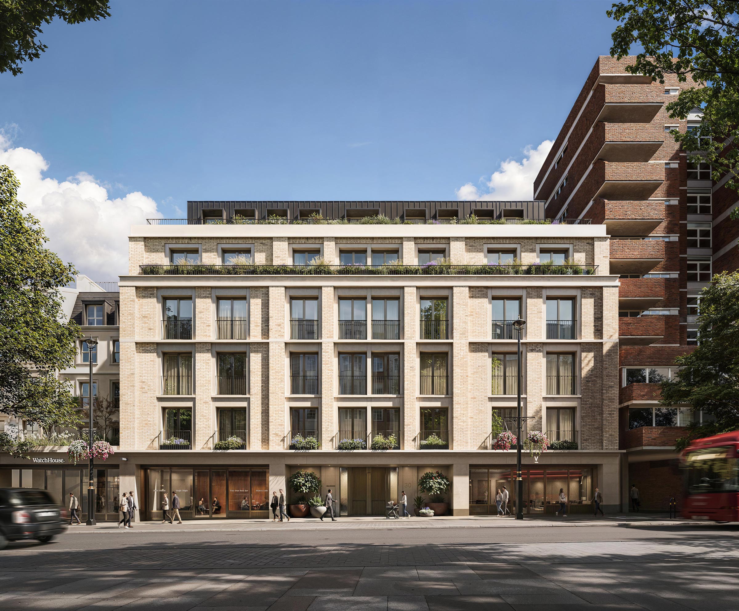The exterior is built around repeating modules, creating a rhythmic facade composed of deep set brickwork piers and bays, beautiful monolithic configurations. A refined material palette of stone, zinc, bronze and glass interconnects in a tactile form.